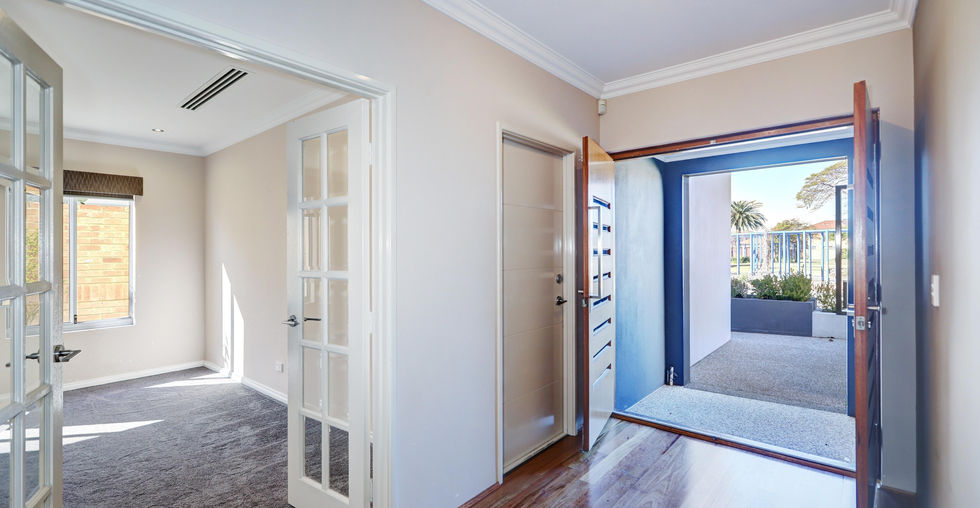 *Front door is secure, stylish and crafted with care from Corinthian SLM 208 – Vertical grain Rosewood. A matching door handle completes the look: Trilock Omni Allure Double Cylinder Pull Handle in Stainless Steel